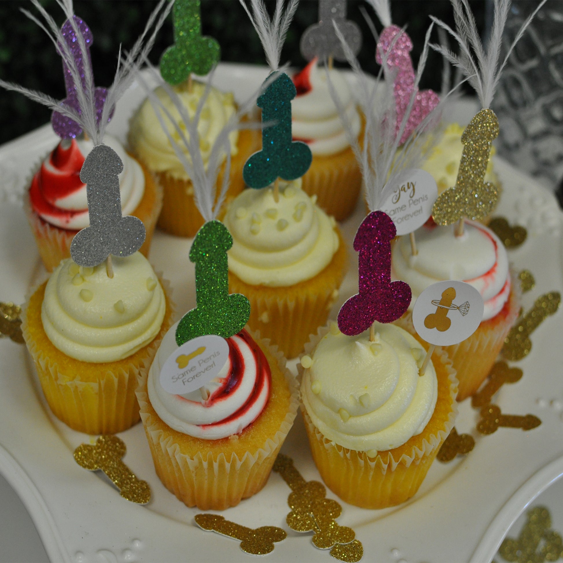 Our Feather Penis Cupcake Toppers are perfect for a Bachelorette Party, Hen Party, or Same Penis Forever theme and look hilarious on cupcakes, as drink garnishes, or on cheese trays (if ya fancy).