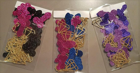 All penis confetti packages include mixed sizes of small (approx .5") and large (approx 1") glitter confetti penises and approx 1" glitter diamonds.
