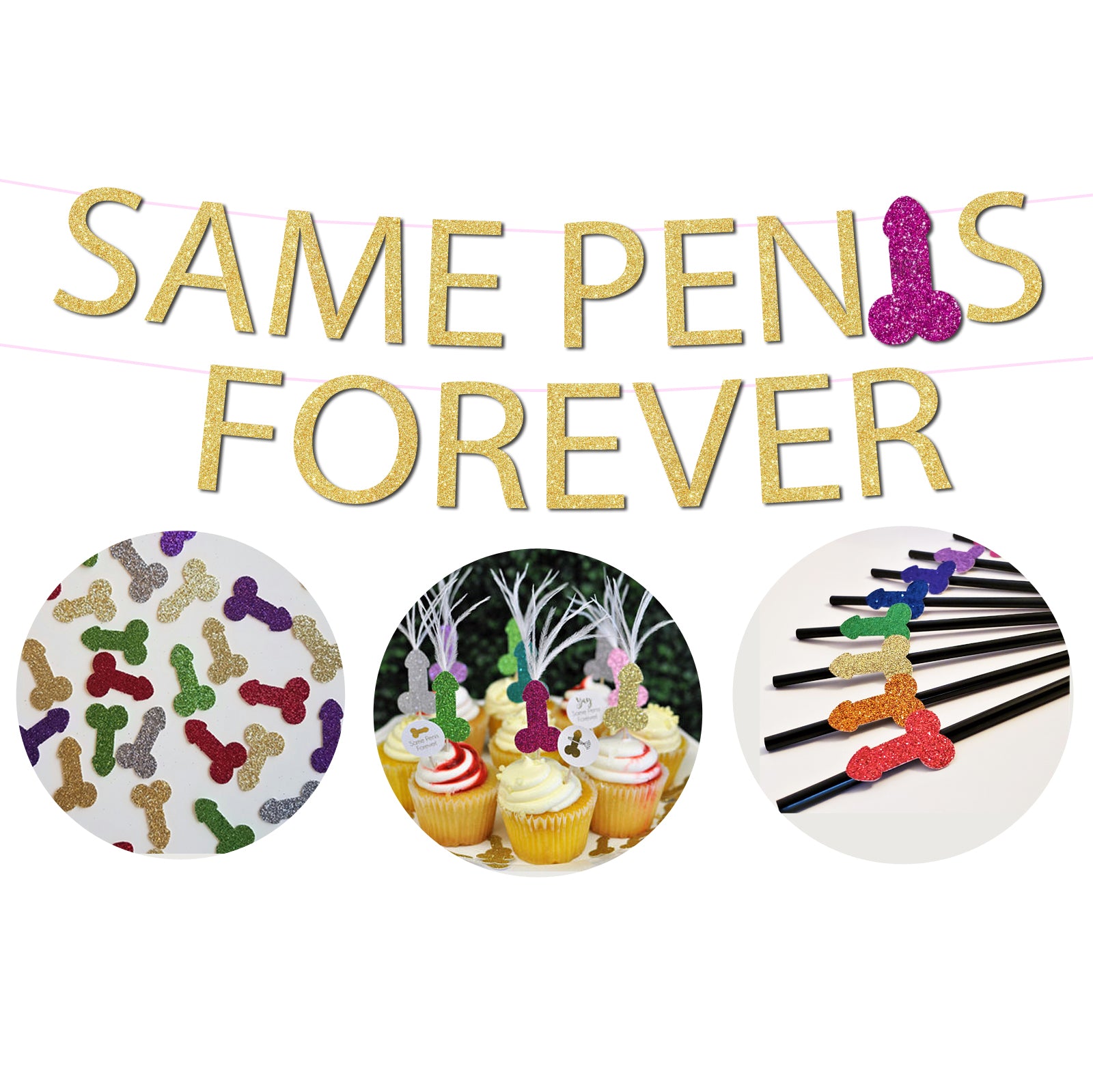 Hang your "Same Penis Forever" banner for an epic Instagram-worthy back drop, sprinkle rainbow penis confetti on your party tables, and sip the night away with our naughty rainbow penis straws!